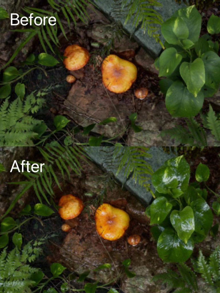 By adjusting the roughness, the whole scene is more like being in the forest that just finished raining, more realistic.